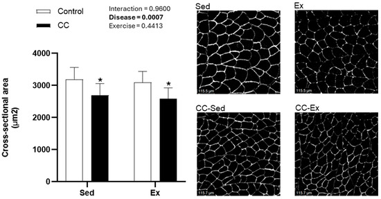 Skeletal muscle histology. Left: Medial gastrocnemius cross-sectional area. Right: Representative gastrocnemius muscle sections. Laminin (white) was used as a membrane marker. Objective 20x. Sed: control sedentary group (n = 9); Ex: control exercised (n = 8); CC-Sed cardiac cachexia sedentary group (n = 7); CC-Ex: cardiac cachexia exercised group (n = 6). * Main effect of Disease.