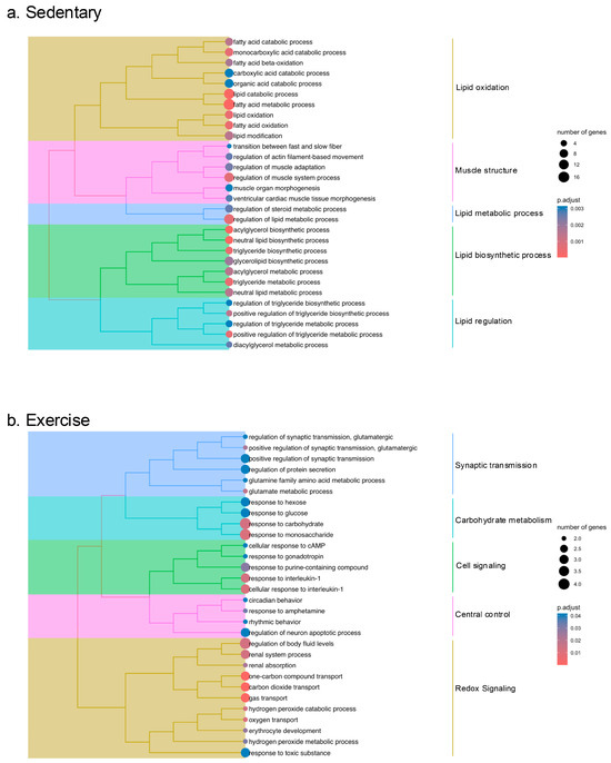Tree plot of enriched biological process GO terms clustered by semantic similarity of (a) sedentary (Sed vs. CC-Sed) and (b) exercise (Ex vs. CC-Ex).