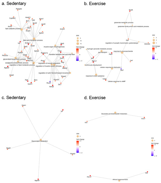 Enriched network plots: GO Biological process from (a) sedentary (Sed vs. CC-Sed) and (b) exercise (Ex vs. CC-Ex). KEGG pathway analysis from (c) sedentary (Sed vs. CC-Sed) and (d) exercise (Ex vs. CC-Ex).
