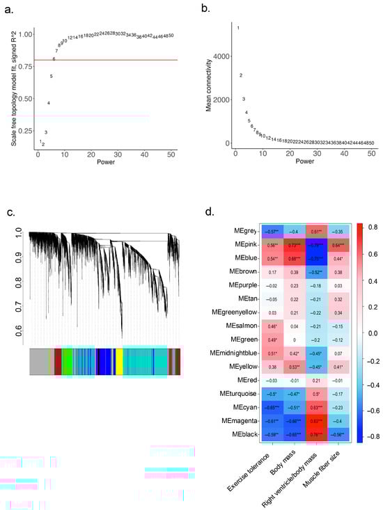 Weighted gene co-expression network analysis (WGCNA). (a) Scale of Independence with soft threshold power (red line); (b) Scale of mean connectivity; (c) Dendrogram highlighting color-coded module eigengenes identified by hierarchical clustering (ME); (d) Correlation between ME and morphometric and exercise intolerance variables. * p < 0.05; ** p < 0.001; *** p < 0.0001.