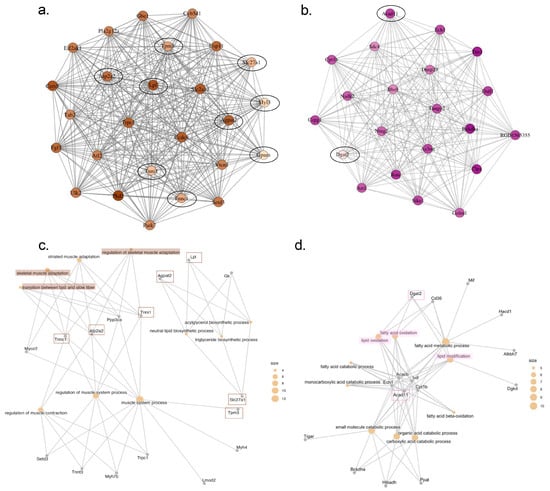 Network visualization of co-expression modules (a) MEbrown and (b) MEmagenta. Genes circled in black overlap with DEGs. Panels (c,d) show enriched GO-BPs shared between module eigengenes and DEGs for MEbrown and MEmagenta, respectively. The top three overlapping GO biological processes terms, as shown in Table 6, are highlighted. Square outlines indicate DEGs connected to the top three overlapping GO biological processes.