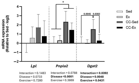 Validation of DEGs related to lipid metabolism in medial gastrocnemius muscle. Sed: control sedentary group; Ex: control exercised; CC-Sed cardiac cachexia sedentary group; CC-Ex: cardiac cachexia exercised group. * Main effect of Disease.