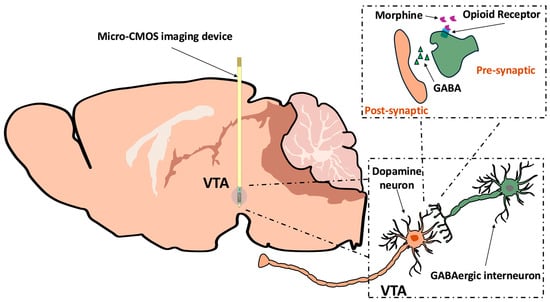 The ability to perceive and interpret noxious stimuli transmitted by the central nervous system (CNS), known as nociception, is a sensory process designed to prevent or minimize injury through nociceptor activation [,]. Though not commonly perceived as integral to pain regulation, the VTA assists complex functions regarding the modulation of affective and motivational components of pain via interaction with GABAergic interneurons and ascending neuromodulatory systems []. Opioids are frequently prescribed to patients experiencing moderate to severe chronic pain, with the most commonly prescribed drug being morphine [,]. An extremely addictive drug with high rates of abuse, morphine binds to the µ-opioid receptors on the presynaptic terminals of the GABAergic interneurons within the VTA, as shown in Figure 1, attenuating the release of GABA and increasing dopaminergic activity [,]. This modulation of the VTA introduces an analgesic effect, significantly reducing the patient’s perception of both chronic and acute pain, primarily due to the increased amount of extracellular DA within the mesocorticolimbic pathway []. Previous research from our group and collaborators using this imaging platform has investigated crucial pathways regarding both pain and addiction, highlighting its effectiveness in a multitude of potential applications [,,,,,]. Our recent works regarding the VTA showed conclusive evidence that the CMOS imaging platform can reliably detect VTA activity fluorescence increases when the reward pathways are activated due to nicotine exposure in both mice and rats [,]. Notably, the intensity of nicotine exposure was directly proportional to the increase in fluorescence activity. Our group previously looked at acute pain response in various brain regions, demonstrating reliability in detecting serotonergic responses with sufficient spatial and temporal resolutions []. Serotonin activation of the dorsal raphe nucleus (DRN) following pain stimulation was observed in tandem with microdialysis, showing the efficacy of understanding and mapping pain and its versatility in being paired with other forms of experimentation to yield a more comprehensive understanding of underlying mechanisms [].