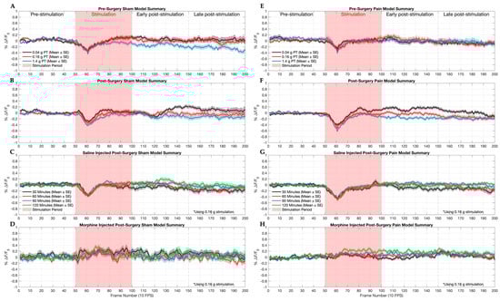 An averaged visualization summary of the percentage change in fluorescence (ΔF/F0) in the VTA over time before, during, and after mechanically induced nociceptive stimulation responses resulting from multiple sham-operated mice (n = 4) and partial nerve ligation (PNL) mice (n = 4), with eight animals in total. Each line is an average of 60 stimulations (mean ± SE). (A) Decreased VTA activity proportional to the stimulation intensity was observed, with the 1.4 g force stimulation showing the weakest rebound excitation. (B) The pain threshold experiment was repeated two weeks after the surgery. A similar response was elicited for each force. The depression in VTA activity is consistent with the pre-surgery pain threshold experiment, and the 1.4 g force response is consistently below baseline. (C) A subcutaneous saline injection was administered one day after the post-surgery pain threshold experiment, and the 0.16 g force filament was applied repeatedly. A consistent response was elicited. (D) A subcutaneous morphine injection (3.0 mg/kg) was administered one day later. Variability in response is reduced, and the depression is considerably weaker. (E) A proportional change in fluorescence respective to the stimulation intensity elicited a clear drop in VTA activity, with the 1.4 g force inducing the most remarkable depression. (F) A clear distinction between each stimulation force was observed, with the 1.4 g force stimulation creating sustained difficulty in returning to baseline. (G) Upon saline administration, exaggerated depression similar to the 0.16 g force of previous pain threshold experiments was observed due to chronic pain. (H) The signature response was nearly eliminated, along with much less variability in response compared to the sham-operated counterpart.