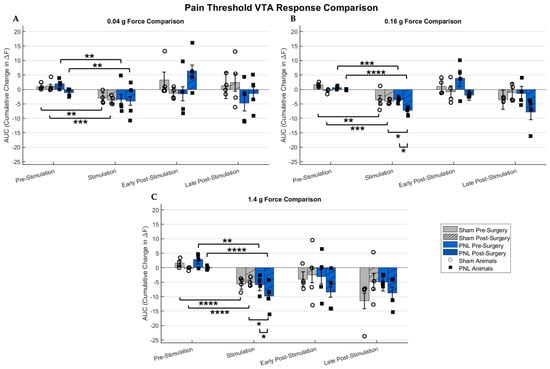 An averaged statistical representation of the area under the curve (AUC) comparing the response of sham-operated and partial nerve ligated (PNL) mice models following exposure to varying stimulation intensities during the pain threshold experiments. Individual points are representative of 15 stimulations averaged per animal, with a total of 60 stimulations for sham (n = 4) mice and 60 stimulations for PNL (n = 4) mice. (A) A comparison of the pre- and post-surgery average response for the 0.04 g force stimulation is shown. A statistically significant difference in VTA activity was observed when comparing before and during stimulation prior to and after the respective cohort surgery. (B) The 0.16 g force stimulation elicited a more exaggerated depression in the VTA, and an interexperimental statistically significant difference was observed for PNL model mice. Statistical significance was also noted between healthy and diseased animals during stimulation. (C) The 1.4 g force realized a much starker response, showing the animals experienced a more intense reaction, and similar statistical significance was noted. Each column represents the mean ± SD of 60 stimuli from four animals. Statistical significance was evaluated using either the appropriate paired t-test or the Wilcoxon Signed-Rank Test following the determination of normality using the Shapiro–Wilk Test. **** denotes p < 0.0001, ±SD. *** denotes p < 0.001, ±SD. ** denotes p < 0.01, ±SD. * denotes p < 0.05, ±SD.