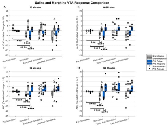 Statistical analysis of therapeutic experiments was also conducted, comparing and highlighting the analgesic effect of morphine on VTA activity in healthy and diseased mice. Figure 4 represents a statistically quantified view of the VTA’s response to pain stimuli, comparing subcutaneous injections of saline and morphine across varying time points. As with the pain threshold response, these averaged stimulations are divided into stimulation subsections. Figure 4A shows that, on average, there is a statistically significant reduction in fluorescence in the VTA during stimulation 30 min after saline injection for the sham and PNL cohorts. We see volatility in response following the morphine injection, but crucially, the signature suppression of VTA activity is not noted. Additionally, there is a statistically significant difference during the stimulation periods following subcutaneous saline and morphine administration. A more consistent response was observed from the PNL model mice. These trends remain consistent across all time points, as shown in Figure 4B–D. No statistical significance was noted when comparing the pre-stimulation and stimulation subsections across all time points under analgesic conditions.