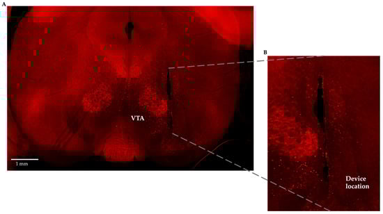 Following the final experiment, the animals underwent perfusion fixation to certify that the results were derived from the positive fluorescence of the VTA due to sufficient GCaMP6s expression. During the terminal procedure, 1 × phosphate-buffered saline (PBS) was irrigated throughout the cardiovascular system to remove excess blood and fluids []. A 4% paraformaldehyde solution was used to fix the tissues, preserving the implantation location and preparing the sample for vibratome slicing. Fluorescence microscopy was utilized to identify positive VTA fluorescence and proper implantation location, as observed in Figure 5. Upon analysis, the implantation location suggests successful visualization of the VTA, as the scar left by the device is located at an appropriate depth in the dorsoventral direction with the sensor facing medially. Additionally, positive fluorescence identification in the area implies that the fluorescence obtained by the CMOS imaging platform directly reflects the VTA’s fluorescence activity. The µ-LED of the CMOS imaging device was positioned correctly to provide excitation wavelengths necessary to visualize the VTA’s response to nociceptive stimulation.