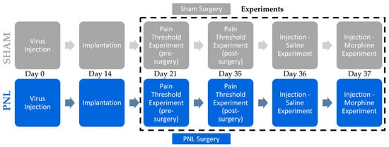 The experimental design was created to allow identical conditions for all the animals, as shown in Figure 6. The animals underwent adeno-associated virus (AAV) microinjection and were allowed two weeks for virus expression. The CMOS imaging device was then implanted into the VTA area, and the subjects were allowed one week for recovery. Next, the animals underwent the initial mechanical nociceptive threshold measurement while recording the fluorescence activity of the VTA. During this experiment, the animal was stimulated repeatedly, with at least 30 s between each stimulation. Immediately following the initial pain threshold experiment, the respective sham or PNL surgery was performed. The animal was allowed to develop neuropathic pain for two weeks, and an identical mechanical nociceptive threshold measurement was conducted. The following day, the animal was administered a subcutaneous injection of saline or morphine and stimulated repeatedly using the 0.16 g force filament, sectioned into 30 min segments. An identical injection protocol using morphine, with a dosage of 3.0 mg/kg, was performed on the next and final day. Each experiment was recorded using the newest CIS-OS analysis hardware and software, elaborated on in our previous study [].