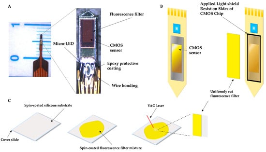The µ-CMOS imaging fabrication process, adapted from our recent paper []. (A) On the left, the custom-designed CMOS imaging device is shown, featuring a CMOS chip measuring 450 µm × 1275 µm and an imaging area of 300 µm × 675 µm. (B) The µ-LED and CMOS chip first adheres to the flexible substrate, and the hand-fabricated filter is thermo-vacuumed to the imaging surface. We apply a black light shield resist along the sides of the CMOS imaging device to interrupt excess light and an epoxy coating for hardware protection. (C) Spin-coating is used on a glass slide to create a smooth silicone substrate layer for the fluorescence filter, and the fluorescence filter mixture is spin-coated on the new foundation and baked. To produce identical, uniformly cut fluorescence filters, a YAG laser is implemented.