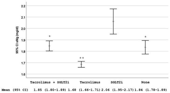 - Secondulfo, C.; Vecchione, N.; Russo, D.; Hamzeh, S.; Iacuzzo, C.; Apicella, L.; Di Pietro, R.A.; Pisani, A.; Amicone, M.; Cirillo, M.; et al. Impact of SGLT2 Inhibitors on Magnesium in Kidney Transplant Patients with and Without Diabetes. Int. J. Mol. Sci. 2025, 26, 2904. [Google Scholar] [CrossRef]