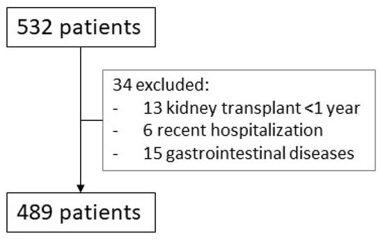 - Duni, A.; Koutlas, V.; Tsitouridis, A.; Tzalavra, E.; Oikonomaki, T.; Kitsos, A.; Rapsomanikis, K.P.; Alekos, J.; Tatsis, V.; Pappas, C.; et al. Longitudinal Assessment of Electrolyte Disorders in a Cohort of Chronic Stable Kidney Transplant Recipients. Transplant. Proc. 2021, 53, 2786–2792. [Google Scholar] [CrossRef]