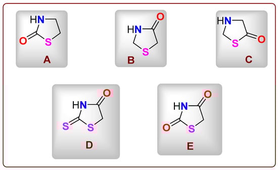 Figure 1 illustrates several thiazolidinone derivatives (A–E) that demonstrate a wide array of biological activities [,]. Compounds with a 2-thiazolidinone core (A) have been studied as inhibitors of the BRD4 bromodomain [], while derivatives with a 5-thiazolidinone scaffold (C) have applications in dye chemistry []. Additionally, 2-thioxo-4-thiazolidinones, also known as rhodanines, are essential structural components in numerous drug-like molecules. For instance, rosiglitazone, used in the treatment of type 2 diabetes, contains thiazolidinone (2,4-dione) pharmacophores. Overall, 4-thiazolidinones have been recognized as privileged structures with a wide range of pharmacological activities, including antitubercular, anti-inflammatory, antiviral, antimicrobial, antidiabetic, and antioxidant properties [].