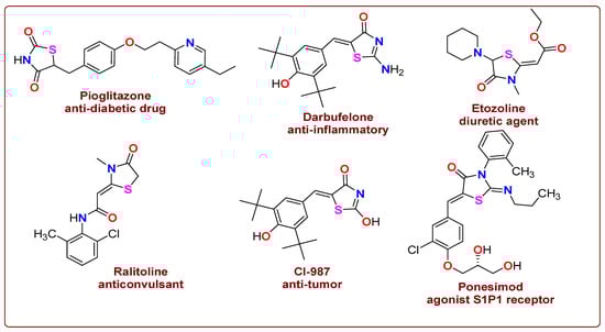 - Aqlan, F.M.; Al-Bogami, A.S.; Alqahtani, N.F.; Wani, M.Y.; Khan, S.A. Thiazolidinone: A structural motif of great synthetic and biological importance. J. Mol. Struct. 2022, 1250, 131771. [Google Scholar] [CrossRef]