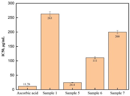 The IC50 of the antioxidant activity of thiazolidinone derivatives 1, 5, 6, and 7 and ascorbic acid.