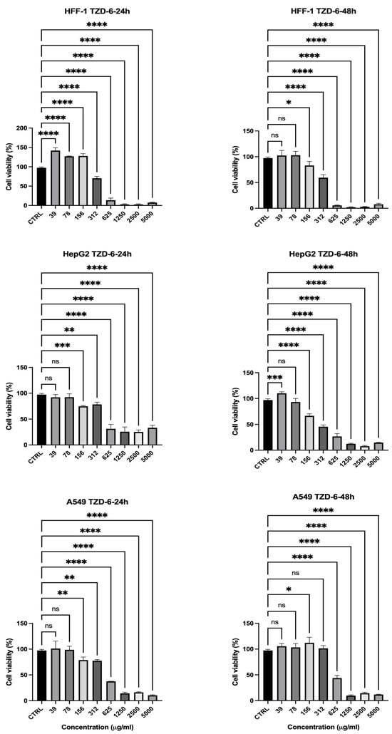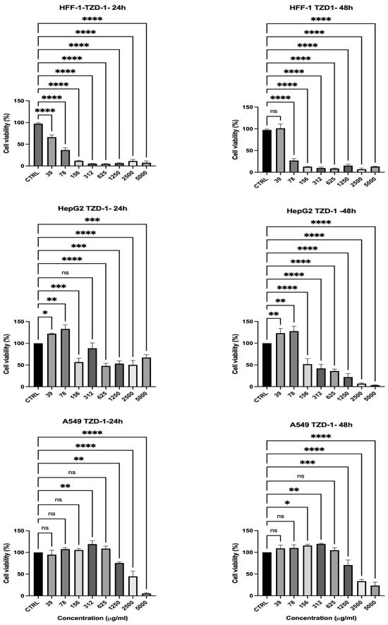 Effect of TZD-1 on cell viability of normal and cancer cell lines after 24 (left)–48 (right) h in culture. Cell viability was assessed using the MTS assay in HFF-1, HepG2, and A549 after treatment with increasing concentrations of TZD-1 (39–5000 μM). Viability was expressed as a percentage relative to the untreated cells (CTRL). Triton X-100 (0.1%) was used as a positive control for complete cell death. A dose-dependent decrease in viability was observed in cancer cell lines, while normal cells (HFF-1) showed higher resistance, indicating the potential selectivity of TZD-1 toward cancer cells. Data is represented as mean ± SD, n = 3. Statistical analysis was performed using the One-Way ANOVA test (* p < 0.5, ** p < 0.01, *** p < 0.001, and **** p < 0.0001, ns = non-significant).