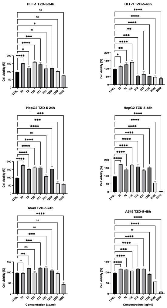 Effect of TZD-5 on cell viability of normal and cancer cell lines after 24 (left)–48 (right) h in culture. Viability was expressed as a percentage relative to the untreated cells (CTRL). The results showed a concentration- and time-dependent cytotoxic response, with HepG2 cells being relatively more sensitive compared to normal HFF-1 and A549 cancer cells, especially at higher concentrations. Data is represented as mean ± SD, n = 3. Statistical analysis was performed using the One-Way ANOVA test (* p < 0.5, ** p < 0.01, *** p < 0.001, and **** p < 0.0001, ns = non-significant).