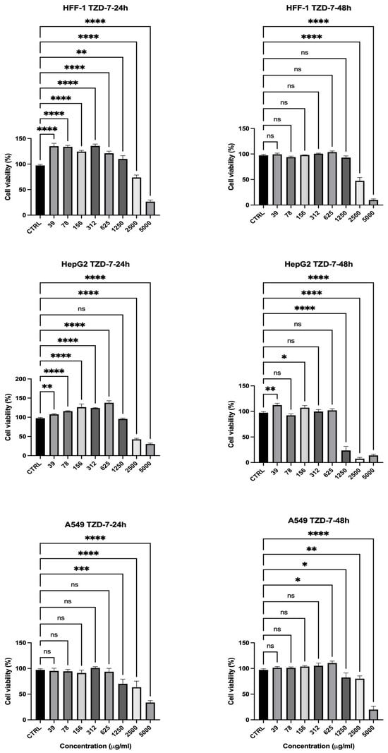 Effect of TZD-7 on cell viability of normal and cancer cell lines after 24 (left)–48 (right) h in culture. Viability is expressed as a percentage relative to the untreated cells (CTRL). TZD-7 demonstrated selective cytotoxicity, effectively reducing the viability of cancer cells (HepG2 and A549) while exerting minimal effects on normal HFF-1 cells at similar concentrations, particularly after 48 h of exposure. Data is represented as mean ± SD, n = 3. Statistical analysis was performed using the One-Way ANOVA test (* p < 0.5, ** p < 0.01, *** p < 0.001, **** p < 0.0001, ns = non-significant).