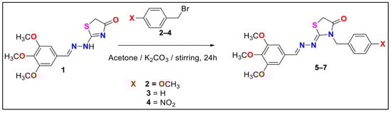 Previously, thiazolidinone 1 was synthesized in good yield via a one-pot cyclocondensation reaction between 2-(3,4,5-trimethoxybenzylidene)hydrazine-1-carbothioamide and ethyl bromoacetate in the presence of sodium acetate. The 1H NMR spectrum of compound 1 exhibited a characteristic singlet at δ = 3.87 ppm, corresponding to the CH2 group of the thiazolidinone ring. The IR spectrum displayed a prominent absorption band for the carbonyl group (C=O) at ν = 1704 cm−1. Additionally, the 13C NMR spectrum of compound 1 showed ten carbon signals [].