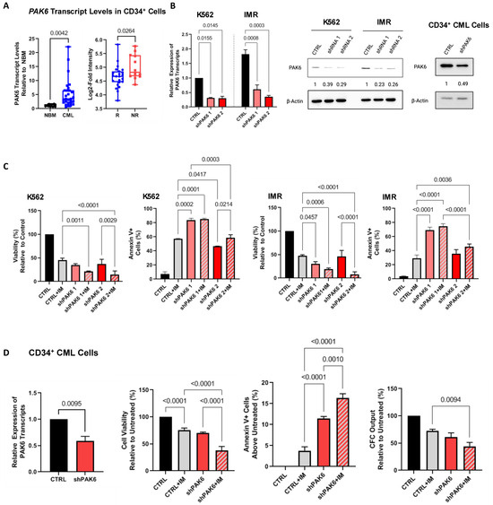 PAK6 has been known to play a prevalent role in promoting several solid tumors, including prostate, gastric, and colorectal cancers [14,16]. Although some group I PAKs, such as PAK1 and PAK2, have been identified as therapeutic targets in hematologic malignancies, little is understood about the role of PAK6, especially in the context of CML [17,18,19]. Interestingly, PAK6 was more highly expressed in CD34+ CML cells compared to healthy bone marrow samples and in TKI-nonresponder patients compared to responders [12]. PAK6 was also elevated in the more primitive CD34+CD38− compartment relative to the differentiated CD34− compartment [12].
