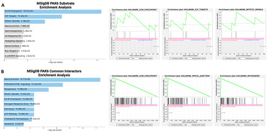Bioinformatics analysis of PAK6 substrates and common protein interactors. (A,B) Gene set enrichment analyses (GSEAs) of PAK6 substrates and common protein interactors identified from the Harmonizome 3.0 dataset repository revealed significant enrichment of biological processes related to the G2-M checkpoint. * = p value (left). Green line indicate enrichment profile and gray lines indicate raking metric scores (right).