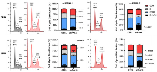 Since we demonstrated that PAK6 suppression can inhibit CML cell proliferation and survival, we wanted to investigate additional oncogenic mechanisms governed by PAK6 in CML. To uncover the biological processes involved downstream of PAK6, we first compiled gene sets of known and predicted PAK6 substrates, as well as common protein interactors, from the Harmonizome 3.0 dataset repository and ran gene set enrichment analyses (GSEAs) using the Enrichr platform [21]. For both the PAK6 substrate and common protein interactor gene sets, we noticed the G2-M checkpoint biological processes to be significantly enriched (Figure 2A,B, Table S3). However, since the GSEA was performed using gene sets largely curated through mass spectrometry, synthetic peptides, and in vitro kinase experiments in non-leukemic cells, we then conducted cell cycle assays on K562 and IMR cells following PAK6 knockdown to investigate changes in cell cycle dynamics in the context of CML. In support of the enrichment analysis, we found that PAK6 knockdown reduced the number of cells in the G0/G1 (p = 0.0058) and S (p = 0.0104) compartments and significantly induced accumulation of cells in the G2-M compartment in K562 cells transduced with the two different PAK6 knockdown constructs as compared to the control (up to 35% vs. 20%, p = 0.0407, Figure 3). Interestingly, this arrest of cells in the G2-M compartment was greater in IMR cells, showing that IMR cells may experience more sensitivity to PAK6 knockdown compared to K562 cells (up to 44%, p = 0.0038, Figure 3). This finding suggests that PAK6 plays a role in facilitating leukemia growth and progression by dysregulating G2-M checkpoint controls.