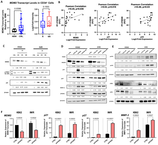 Identification of a PAK6-mediated MDM2-P21 axis in CML cells. (A) qRT-PCR analysis of MDM2 transcript levels in CD34+ cells from 23 CML samples compared to 11 NBM samples (left) and analysis of the GSE14671 microarray dataset from 24 IM-responders and 12 IM-nonresponders (right). (B) Correlation analysis using the Cancer Therapeutics Research Portal (CTRPv2) database between MDM2, p21, and p53 expression and their sensitivities to the PAK inhibitor PF-3758309, as measured by area-under-curve (AUC) values. (C) Western blot analysis of PAK6 phosphorylation, MDM2, and p21 protein expression in K562 and IM-resistant cells (IMR) treated with PF-3758309 (PF) at 16, 24, and 48 h. Quantification of protein expression levels relative to β-Actin as indicated. (D–E) Western blot analysis of protein expression and phosphorylation of senescence-associated biomarkers and DNA damage markers, following PAK6 knockdown in K562 and IMR cells, quantifying protein expression levels relative to β-Actin as indicated. (F) qRT-PCR analysis of transcript levels of senescence-associated biomarkers in PAK6 knockdown cells.