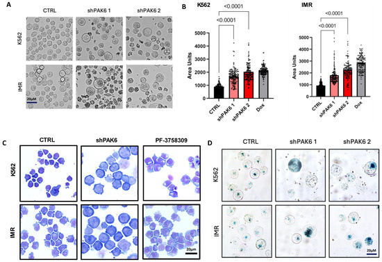 Inhibition of PAK6 increases cell size in CML cells. (A,B) Representative phase-contrast images and quantification of cell size in K562 and IM-resistant cells (IMR) following PAK6 knockdown, including senescence-inducing compound doxorubicin (Dox), used as a positive control. (C) GIEMSA staining of K562 and IMR cells following PAK6 knockdown or treatment with PF-3758309 (10 nM). (D) Representative images of senescence-associated β-galactosidase (SABG) staining of K562 and IMR cells following PAK6 knockdown.