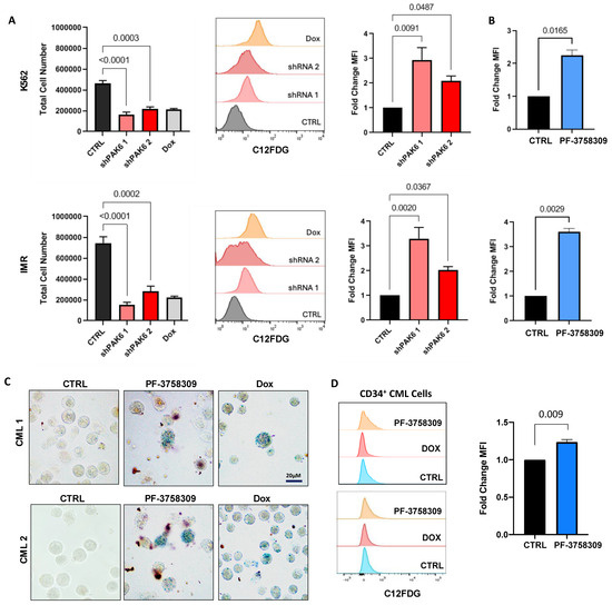 PAK6 knockdown induces senescence-associated phenotypes in CML cells. (A) Total cell numbers generated in K562 and IM-resistant cells (IMR) following PAK6 knockdown, including a Dox control, after 48 h of treatment with C12FDG. C12FDG-mediated SABG assays were then performed on these cells and analyzed by FACS histograms, with corresponding quantification of mean fluorescence intensity MFI (bar plots). (B) Fold changes of differences in K562 and IMR cells treated with the PAK inhibitor PF-3758309 (10 nM), with corresponding quantification of MFI by C12FDG-mediated SABG assays. (C,D) Representative images of SABG staining and C12FDG-mediated SABG assays conducted in CD34+ nonresponder primary cells treated with PF-3758309 (10 nM). Intense staining of blue color in cells indicates increased β-galactosidase expression.