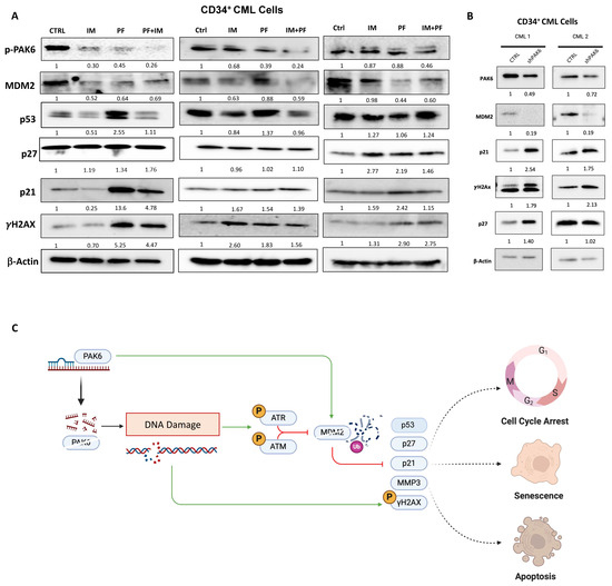 In this study, we investigated the role of PAK6 in mediating TKI resistance and cell survival using the pan-PAK inhibitor PF-3758309, as well as a lentiviral-mediated PAK6 knockdown strategy, in IM-resistant cell lines and CD34+ TKI-nonresponder cells. We find that pharmacological and genetic suppression of PAK6 reduces survivability and proliferation, particularly when combined with IM treatment. We also demonstrate that PAK6 knockdown can induce DNA damage-associated G2-M cell cycle arrest and senescence by modulating the expression of MDM2, p21, and other senescence protein markers. Thus, our findings suggest that PAK6 may be an attractive therapeutic target due to its role in mediating the DNA damage response and governing multiple cell fates, including senescence and apoptosis, in the context of CML.