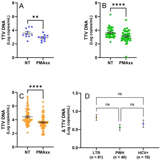 TTV results of testing samples by ddPCR before and after the PMAxx™ treatment. (A) Fresh samples (n. 10, in blue) untreated (NT) and treated with PMAxx™. (B) Frozen PWH samples (n. 40, in green), untreated (NT) and treated with PMAxx™. (C) Frozen LTR samples (n. 81, in orange), untreated (NT) and treated with PMAxx™. (D) Δ TTV DNA stratified by study population (HCV+, LTR, and PWH). Black lines indicate the mean and standard error of the mean (SEM); asterisks indicate statistical significance levels (** p < 0.01; **** p < 0.0001; ns = not significant).