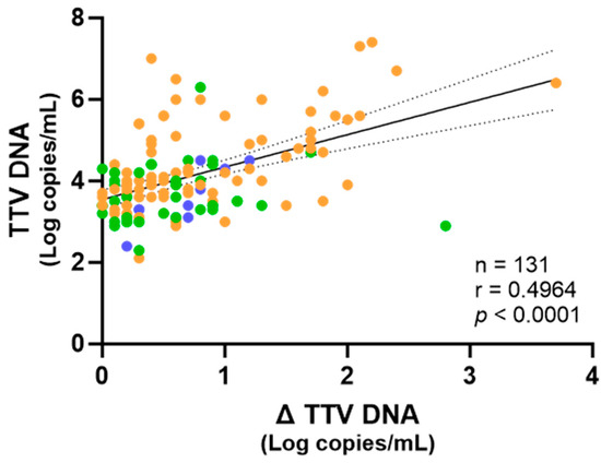 Importantly, linear regression analysis conducted on the combined dataset including all samples revealed that untreated TTV DNA viremia was positively correlated with the Δ TTV DNA (Figure 2).
