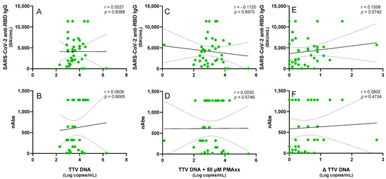 Correlations of the untreated and PMAxx™-treated TTV DNA levels with the anti-SARS-CoV-2 IgG levels and nAbs responses in the PWH. Correlations between the TTV DNA and the (A) SARS-CoV-2 anti-RBD IgG and (B) nAbs. Correlations between the PMAxx™-treated TTV DNA and the (C) SARS-CoV-2 anti-RBD IgG and (D) nAbs. Correlations between the Δ TTV DNA and the (E) SARS-CoV-2 anti-RBD IgG and (F) nAbs. Each point represents an individual sample. Regression lines, confidence intervals, p-values, and r values are shown.