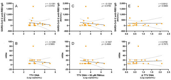 Correlations of the untreated and PMAxx™-treated TTV DNA levels with the anti-SARS-CoV-2 IgG levels and nAbs responses in the LTR patients. Correlations between the TTV DNA and the (A) anti-SARS-CoV-2 RBD IgG levels and (B) nAbs titers. Correlations between the PMAxx™-treated TTV DNA and the (C) anti-SARS-CoV-2 RBD IgG levels and (D) nAbs titers. Correlations between the Δ TTV DNA and the (E) SARS-CoV-2 anti-RBD IgG and (F) nAbs. Each point represents an individual sample. Regression lines, confidence intervals, p-values, and r values are shown.