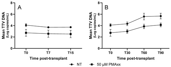 TTV DNA kinetics of untreated and PMAxx™-treated samples from 5 LTR patients. (A) TTV DNA levels within 15 days post-transplantation. (B) TTV DNA levels until 90 days post-transplantation. Each point represents the mean Log copies/mL from five patients; error bars indicate the standard error of the mean (SEM). NT, untreated samples.
