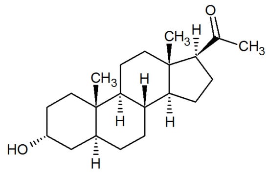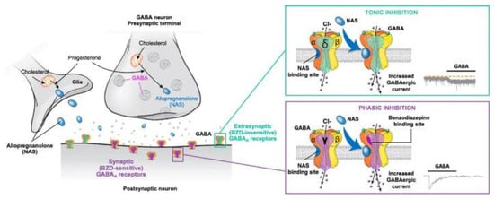 Neuroactive steroids are endogenous neuromodulators that rapidly alter neuronal excitability by binding to membrane-bound receptors. They can be de novo synthesized in the brain from cholesterol, particularly within excitatory neurons, but also glial cells, and their synthesis is altered by acute cellular and environmental stressors [,]. They can also reach the brain from peripheral steroidogenic organs, such as the adrenal glands and gonads []. A major class of these steroids includes allopregnanolone, a progesterone metabolite []. Neuroactive steroids powerfully modulate major targets in the brain by affecting ligand-gated and voltage-gated ion channels that regulate neuronal excitability, intercellular communication, and plasticity []. They are essential in the regulation of the hypothalamic–pituitary–adrenal axis during acute and chronic stress [,]. In addition, they exert anti-inflammatory and neurotrophic effects [,,,], and induce potent anxiolytic, antidepressant, anticonvulsant, sedative, analgesic, and amnesic effects, mainly through interaction with the GABAARs in the brain [].