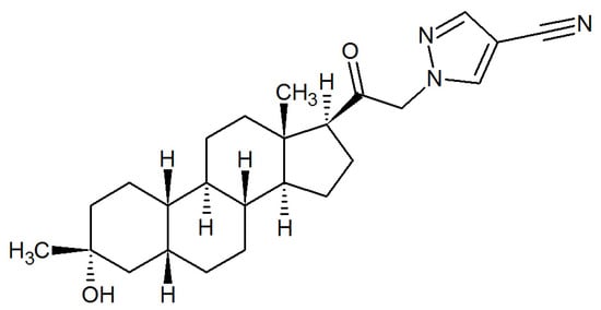 On 4 August 2023, the FDA approved zuranolone (SAGE-217; ZURZUVAE™), developed by Sage Therapeutics Inc. (Cambridge, MA, USA) and Biogen Inc., (Cambridge, MA, USA) as the first oral neuroactive steroid-based drug for the treatment of PPD [,]. The chemical structure of zuranolone, 1-[(3α,5β)-3-hydroxy-3-methyl-20-oxo-19-norpregnan-21-yl]-1H-pyrazole-4-carbonitrile, is distinct from brexanolone due to the presence of a cyanopyrazole ring at carbon 21 [] (Figure 3). When compared with brexanolone, zuranolone has the advantage of being orally bioavailable, and thus offers the ease of once-daily, evening dosing at home.