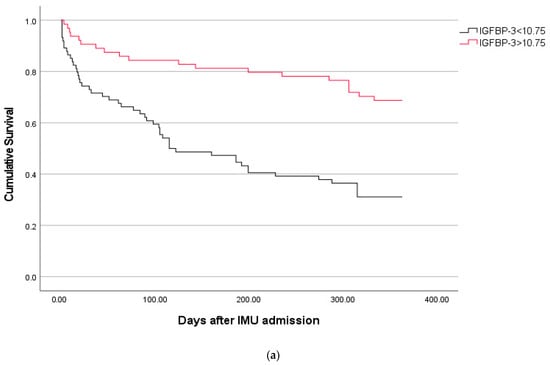 The optimal cut-off for IGFBP-3 in predicting 1-year mortality was 10.75. The Kaplan–Meier analysis revealed a significant association between this IGFBP-3 cut-off and 1-year mortality (Log-rank p < 0.001; Figure 1a).