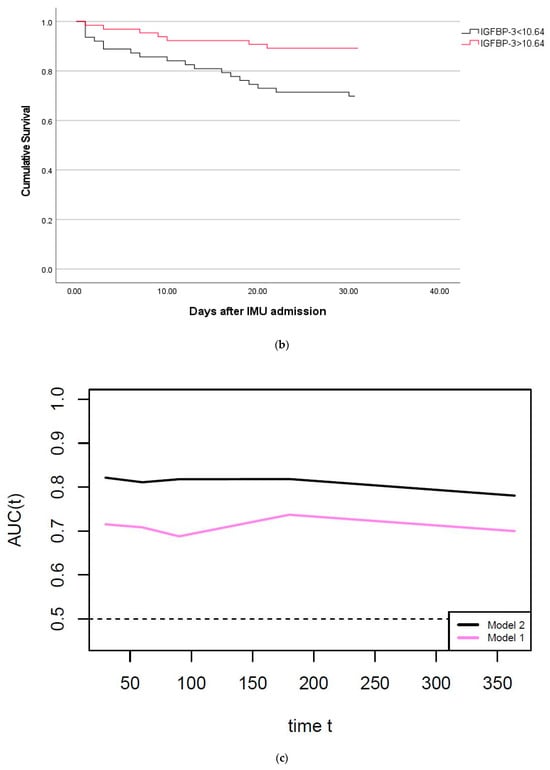 (a) Kaplan–Meier curves of freedom from 1-year mortality for patients grouped according to the best prognostic cut-off of insulin-like growth factor-binding protein-3 levels. Abbreviations: IGFBP-3 = insulin-like growth factor-binding protein-3 (expressed as Log levels), IMU = internal medicine unit. Legend: Log-rank < 0.001. (b) Kaplan–Meier curves of freedom from 30-day mortality for patients grouped according to the best prognostic cut-off of insulin-like growth factor-binding protein-3 levels. Abbreviations: IGFBP-3 insulin-like growth factor-binding protein-3 (expressed as Log levels), IMU = internal medicine unit. Legend: Log-rank = 0.007. (c) Time-dependent receiver operating characteristic curves of Model 1 and Model 2 for predicting mortality up to 1 year from internal medicine unit admission. Abbreviations: AUC = area under the receiver operating characteristic curve. Legend: Model 1 includes age, SOFA score, and multiple sources of sepsis. Model 2 includes age, SOFA score, multiple sources of sepsis, and insulin-like growth factor-binding protein-3 levels expressed as Log levels. Time is expressed in days from internal medicine unit admission.
