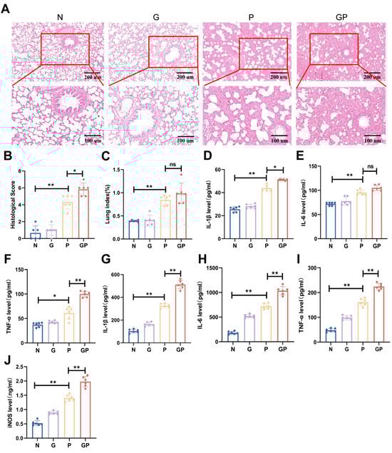 A high-calorie diet significantly aggravates lipopolysaccharide(LPS)-induced pneumonia in juvenile rats. (A) H&E staining (100×/200×). (B) Quantified scoring of pulmonary pathology. (C) The lung index of rats. (D–F) Serum IL-1β, IL-6, and TNF-α levels were quantified using ELISA. (G–I) IL-1β, IL-6, and TNF-α levels in lung tissues were quantified using ELISA. (J) Serum iNOS levels were quantified using ELISA. Data are represented as the mean ± SD (n = 6). * p < 0.05, ** p < 0.01, and ns (p > 0.05).