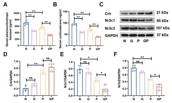 Our results showed that compared with the N group, the expression levels of adrenocorticotropic hormone (ACTH) and corticosterone (CORT) in peripheral blood significantly decreased in juvenile rats fed a high-calorie diet (Figure 2A,B, Supplementary Table S1), but this did not induce significant changes in the protein expression levels of corticotropin-releasing hormone (Crh), nuclear receptor subfamily 3 group c member 1 (Nr3c1), and nuclear receptor subfamily 3 group c member 2 (Nr3c2) in hypothalamus tissues (Figure 2C–F). Compared with the P group, there was no significant change in the expression level of Crh protein in the hypothalamus of the GP group rats (Figure 2C,D), while the protein expression levels of Nr3c1 and Nr3c2 significantly decreased (Figure 2C,E,F) and those of ACTH and CORT in peripheral blood significantly decreased as well (Figure 2A,B). These data showed that the aggravation of LPS-induced pneumonia from a high-calorie diet may be due to its disruption of the HPA axis balance.