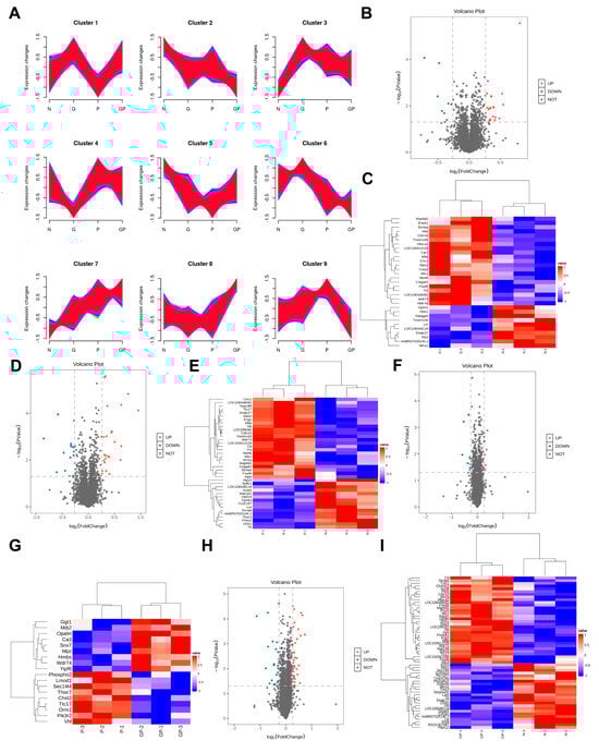Differences in protein expression in the hypothalamic tissue between N, G, P, and GP rats. (A) The Mfuzz cluster analysis was performed on N, G, P, and GP groups proteomics. The color from blue to red indicates that the membership value of this protein increases, which represents the protein’s importance in the cluster to some extent. (B) The volcano map of the G group compared to the N group. (C) The differential proteins enrichment analysis clustering heatmap of the G group compared to the N group. (D) The volcano map of the P group compared to the N group. (E) Differential proteins enrichment analysis clustering heatmap of the P group compared to the N group. (F) The volcano map of the GP group compared to the P group. (G) The differential proteins enrichment analysis clustering heatmap of the GP group compared to the P group. (H) The volcano map of the GP group compared to the N group. (I) The differential proteins enrichment analysis clustering heatmap of the GP group compared to the N group.
