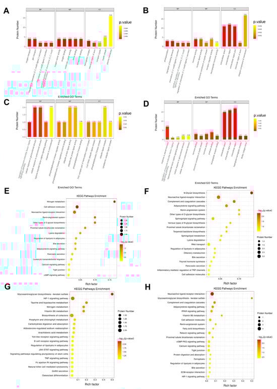 Gene ontology and kyoto encyclopedia of genes and genomes(KEGG) enrichment analyses. (A) Gene ontology of DEPs between the N and G groups. (B) Gene ontology of DEPs between the N and P groups. (C) Gene ontology of DEPs between the GP and P groups. (D) Gene ontology of DEPs between the N and GP groups. (E) KEGG enrichment analysis of DEPs between the N and G groups. (F) KEGG enrichment analysis of DEPs between the N and P groups. (G) KEGG enrichment analysis of DEPs between the GP and P groups. (H) KEGG enrichment analysis of DEPs between the N and GP groups.