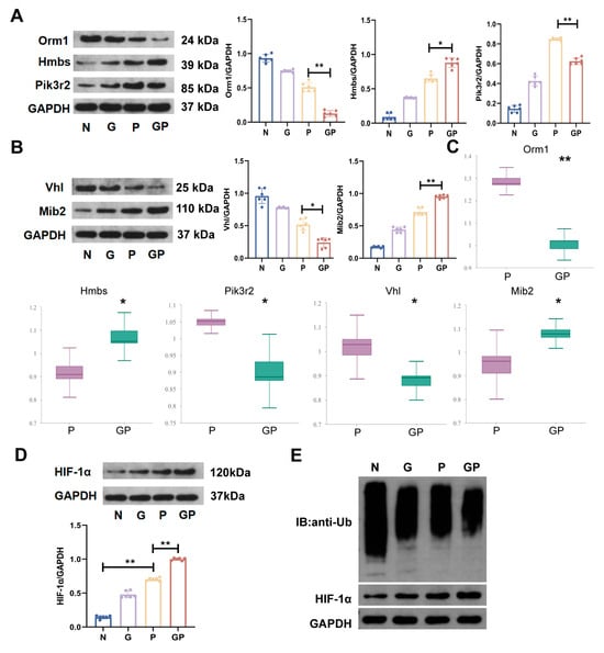 Validation of differentially expressed proteins (DEPs). (A) The levels of Orm1, Hmbs, and Pik3r2 in the hypothalamic tissues were evaluated by Western blotting. (B) The levels of VHL and Mib2 in the hypothalamic tissues were evaluated by Western blotting. (C) Differences in the expression of proteins between the GP and P groups in the proteome data. (D) The levels of HIF-1α in the hypothalamic tissues were evaluated by Western blotting. (E) The levels of HIF-1α ubiquitination in the hypothalamic tissues were evaluated by co-immunoprecipitation. Data are represented as the mean ± SD (n = 6). * p < 0.05, ** p < 0.01.