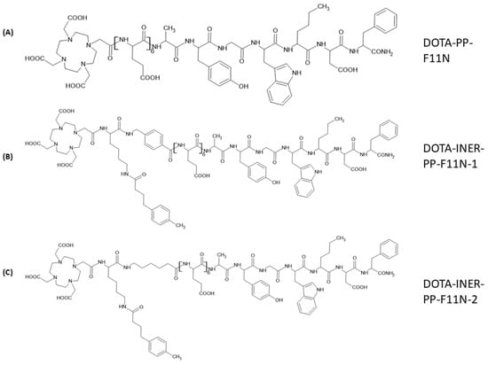 Lutetium-177 (177Lu), a theranostic radionuclide emitting both β- and γ-radiation, was purchased from Isotopia Molecular Imaging (Petach Tikva, Israel). The labeling of the same peptide series with 177Lu was carried out as previously described []. Briefly, 40 μg of peptide and approximately 1 mCi of 177LuCl3 were mixed in 0.2 M ascorbic acid buffer (pH 4.8) in a final volume of 150 μL per vial, and incubated at 95 °C for 60 min. The labeling efficiencies of [177Lu]Lu-DOTA-PP-F11N, [177Lu]Lu-DOTA-INER-PP-F11N-1, and [177Lu]Lu-DOTA-INER-PP-F11N-2 were evaluated using iTLC-SG with 10% methanol as the mobile phase, and by radio-HPLC.