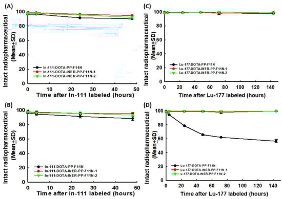 Both [111In]In-DOTA-INER-PP-F11N-1 and [111In]In-DOTA-INER-PP-F11N-2 had more stable properties than the original structure. In contrast to the stable state at 4 °C PBS, DOTA-PP-F11N conjugated with In-111 demonstrated less metabolic stability at 37 °C FBS (Figure 2B). [111In]In-DOTA-PP-F11N, [111In]In-DOTA-INER-PP-F11N-1, and [111In]In-DOTA-INER-PP-F11N-2 showed reliable radiopharmaceutical stability at either 4 °C PBS or 37 °C physiological conditions for 48 h.