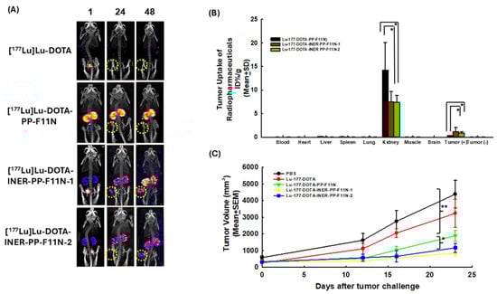 DOTA-PP-F11N, DOTA-INER-PP-F11N-1, and DOTA-INER-PP-F11N-2 labeled with Lu-177 were also measured either at 4 °C PBS or 37 °C FBS at each of the time points described previously. DOTA-PP-F11N, DOTA-INER-PP-F11N-1, and DOTA-INER-PP-F11N-2 labeled with Lu-177 showed more than 90% metabolic stability at each time point (Figure 2C). [177Lu]Lu-DOTA-PP-F11N, [177Lu]Lu-DOTA-INER-PP-F11N-1, and [177Lu]Lu-DOTA-INER-PP-F11N-2 showed similar metabolic stability at 4 °C—more than 95% at 4 °C PBS, even 144 h after Lu-177 labeling.