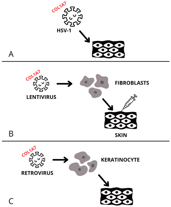 (A) This figure presents a model of the use of B-VEC. (B) This figure presents an overview of the therapy, consisting of collecting fibroblasts from patients, infecting them with a lentivirus carrying the COL1A7 gene, and then subcutaneously injecting the infected cells. (C) This figure presents a method of transplanting retrovirus-infected keratinocytes.