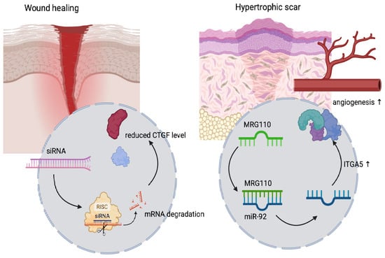 iRNAs targeting CTGF mRNA aim to reduce CTGF protein levels, and as a result, fibrosis and scarring in hypertrophic scars. MRG-110 targets miR-92a, a negative regulator of integrin alpha 5 (ITGA5). Inhibiting miR-92a leads to increased ITGA5 expression, enhancing angiogenesis and promoting wound healing. CTGF—Connective Tissue Growth Factor; MRG-110—Antagomir Targeting miR-92a, ITGA5—integrin alpha 5, miR-92a—mi-RNA 92a.