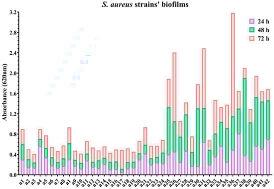 Biofilm formation of 42 S. aureus strains over 24, 48, and 72 h, measured by absorbance at 620 nm. All isolates demonstrate biofilm production, with increasing intensity over time. Strains a 25, a26, a30, a31, a36, a38 and a40 exhibited the strongest biofilm formation, while others showed moderate to low levels. Overall, biofilm-forming capacity is variable and strain-dependent.