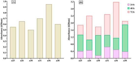 Biofilm-forming capacity of S. aureus strains isolated from paronychia; (A) mean absorbance at 72 h shows enhanced biofilm formation in strains a25, a26, a30, a31, a36, and a38; (B) time-course analysis (24 h—purple, 48 h—green, 72 h—red) demonstrates consistent biofilm development, with the highest levels observed at 72 h.